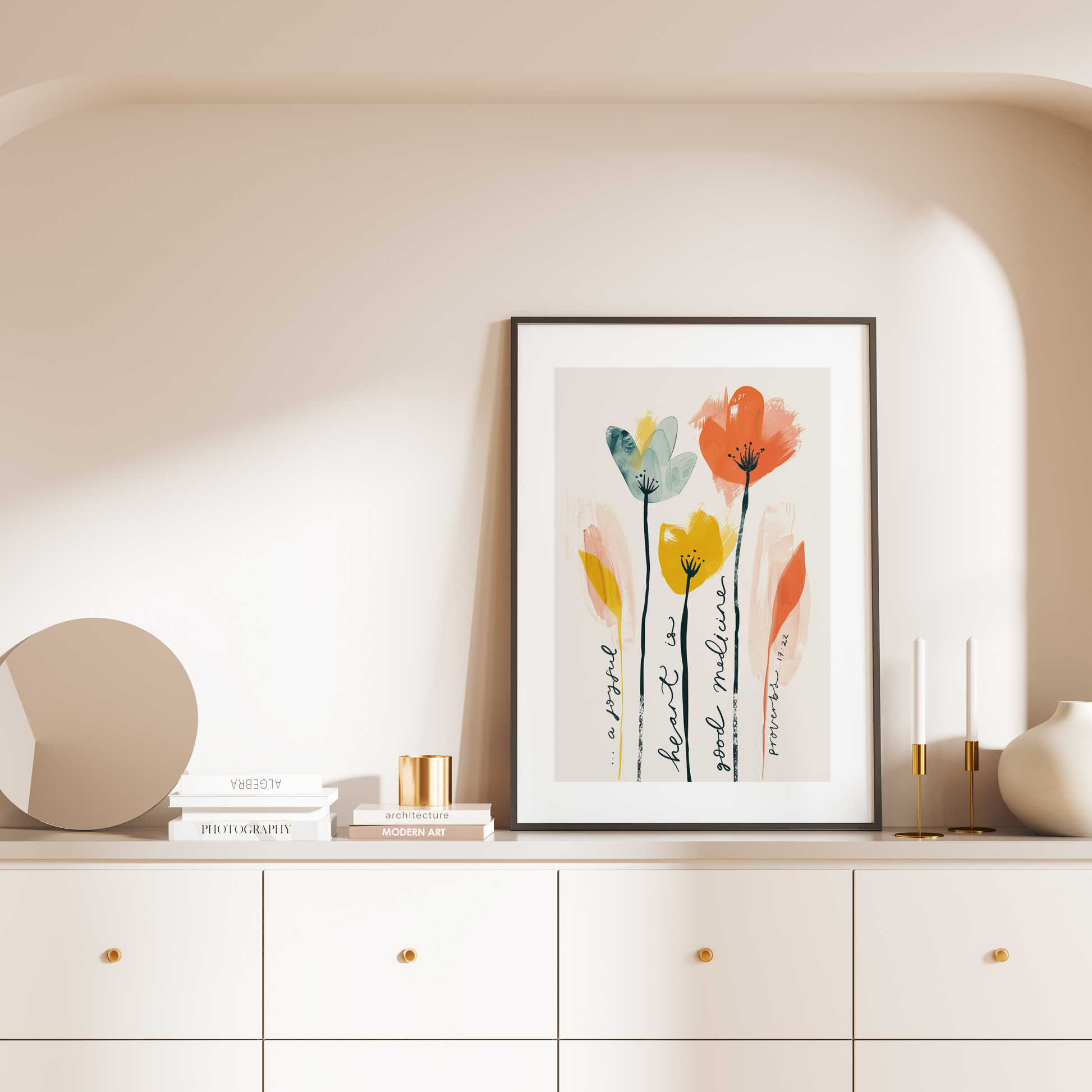 This modern art print features vibrant flowers delicately painted, intertwined with the timeless words of Proverbs 17:22. This captivating piece effortlessly brings joy to any space and would make a lovely gift for a loved one or yourself.