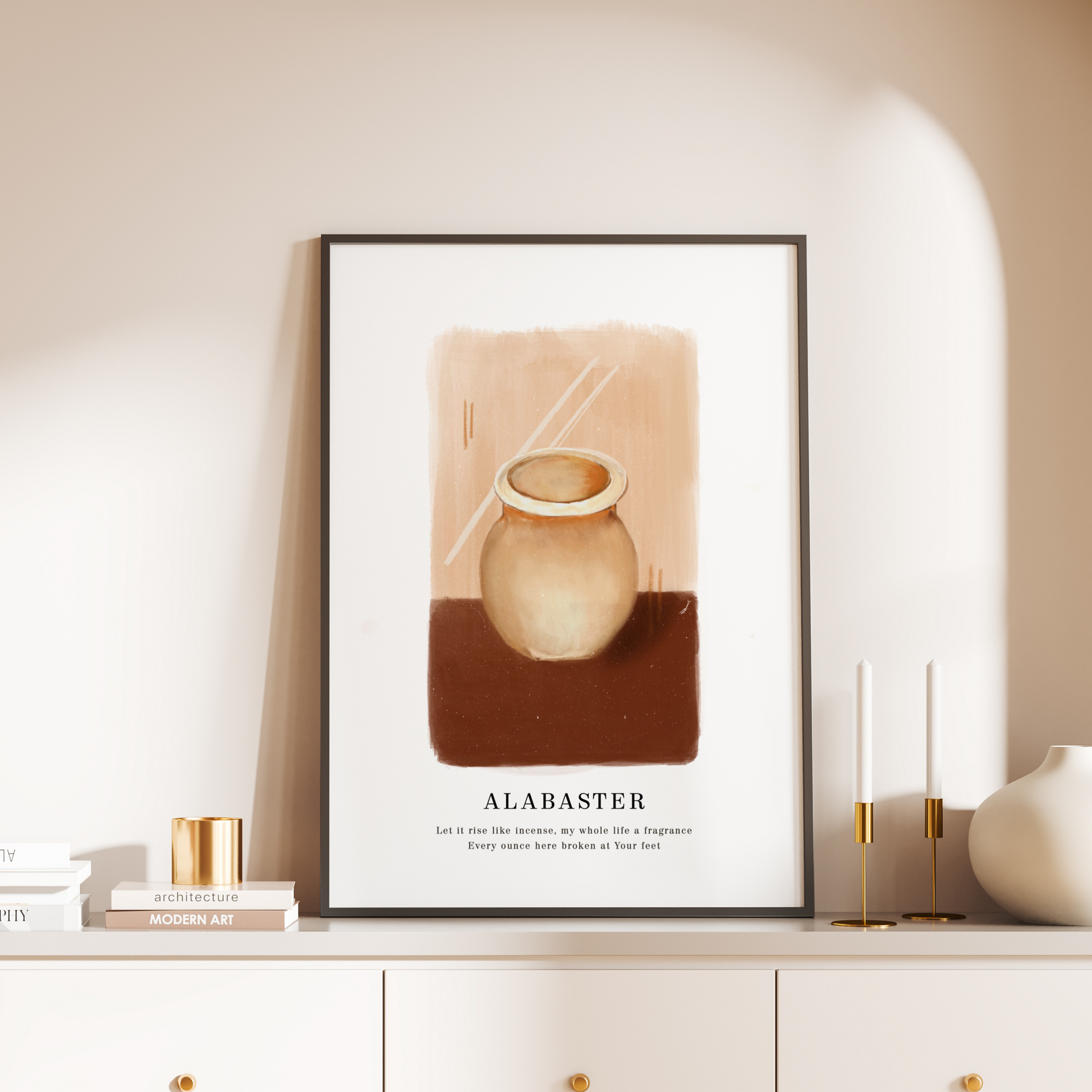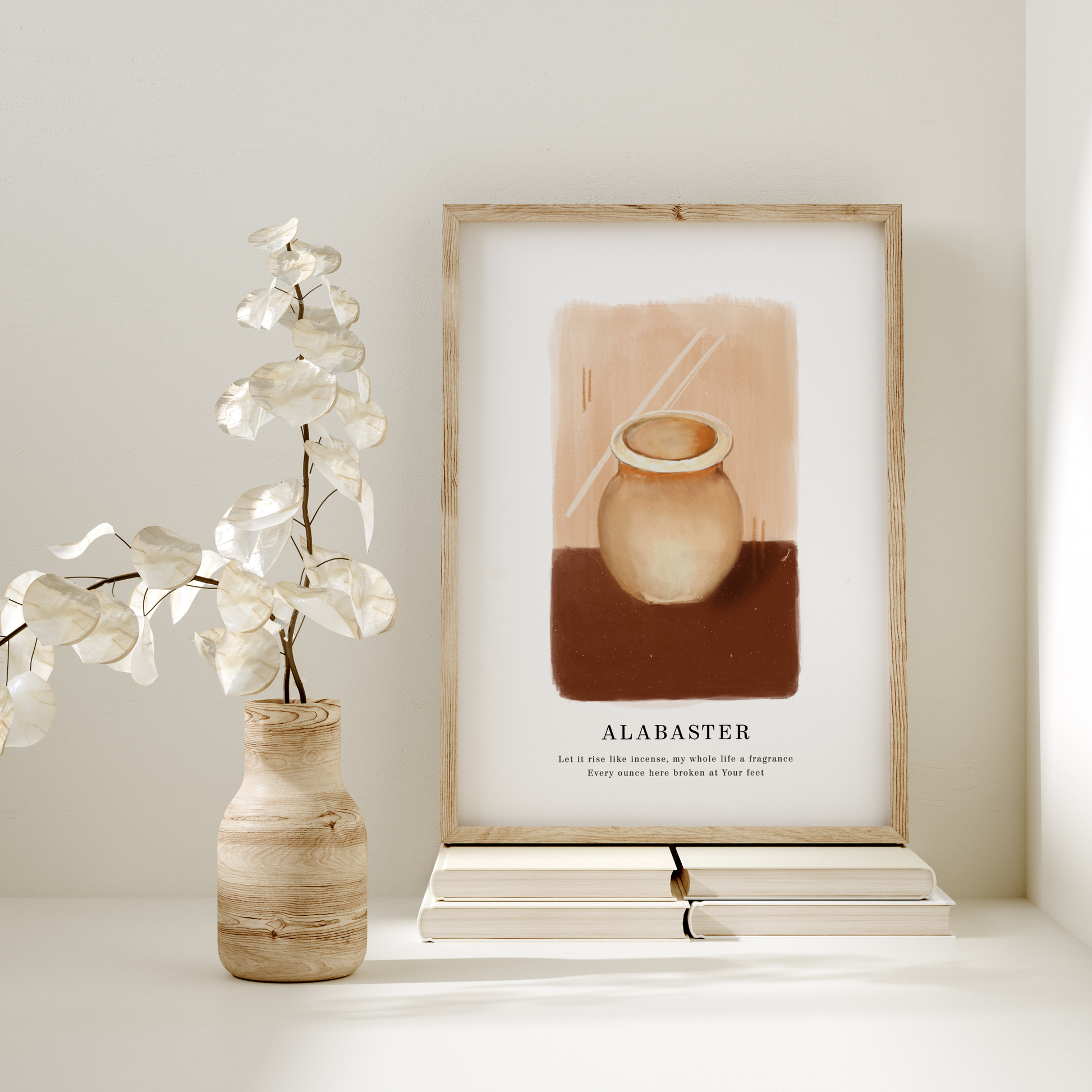 Alabaster print is a beautiful representation of the Alabaster Jar featured in The Bible. It is a reminder of that nothing can be more ‘true’ than breaking our hearts open before the Lord and pouring them out for Him (Phil. 2:17; 2 Tim. 4:6). This art piece has been painted by Sharmila Joy and reproduced as a print.