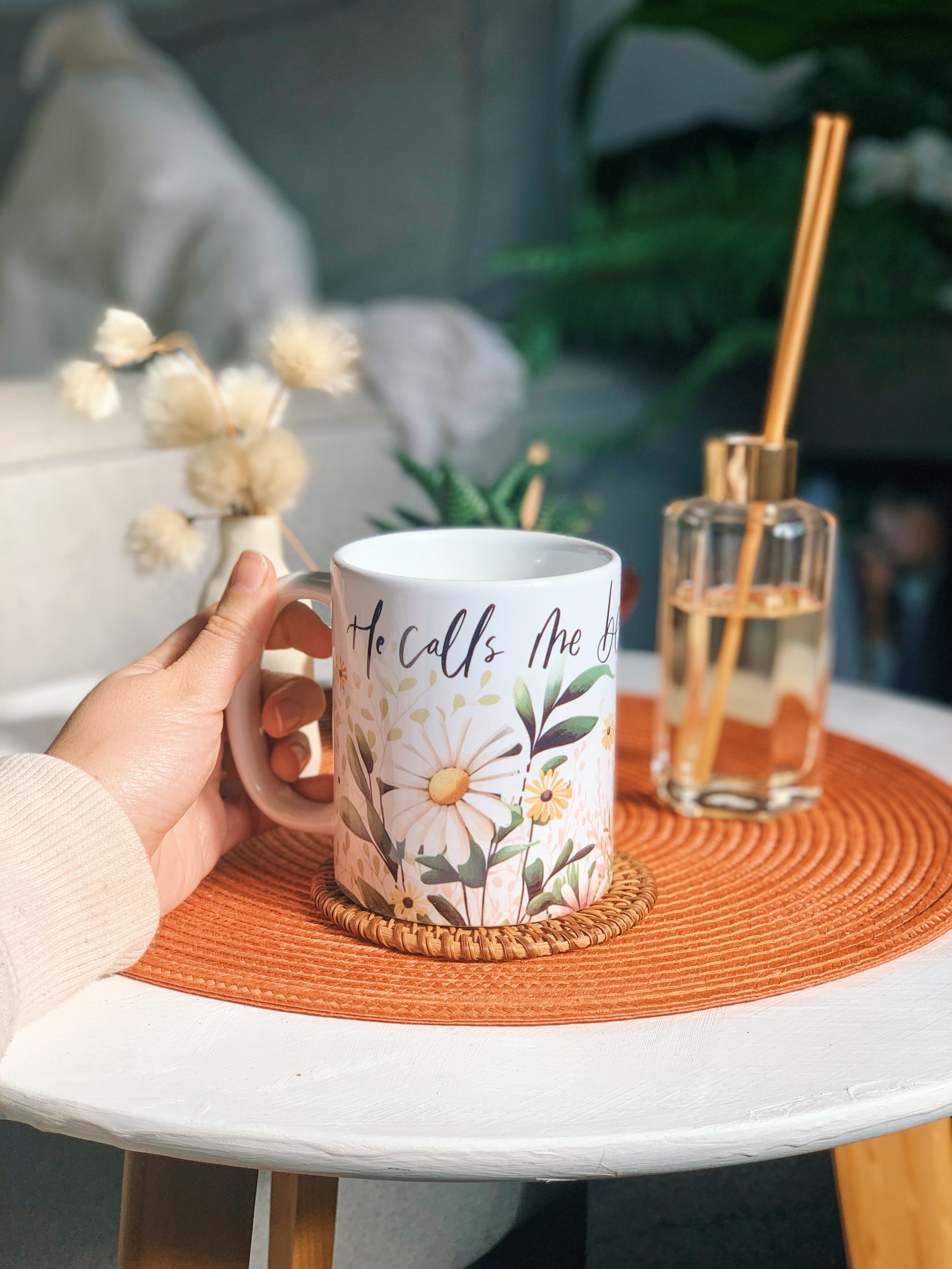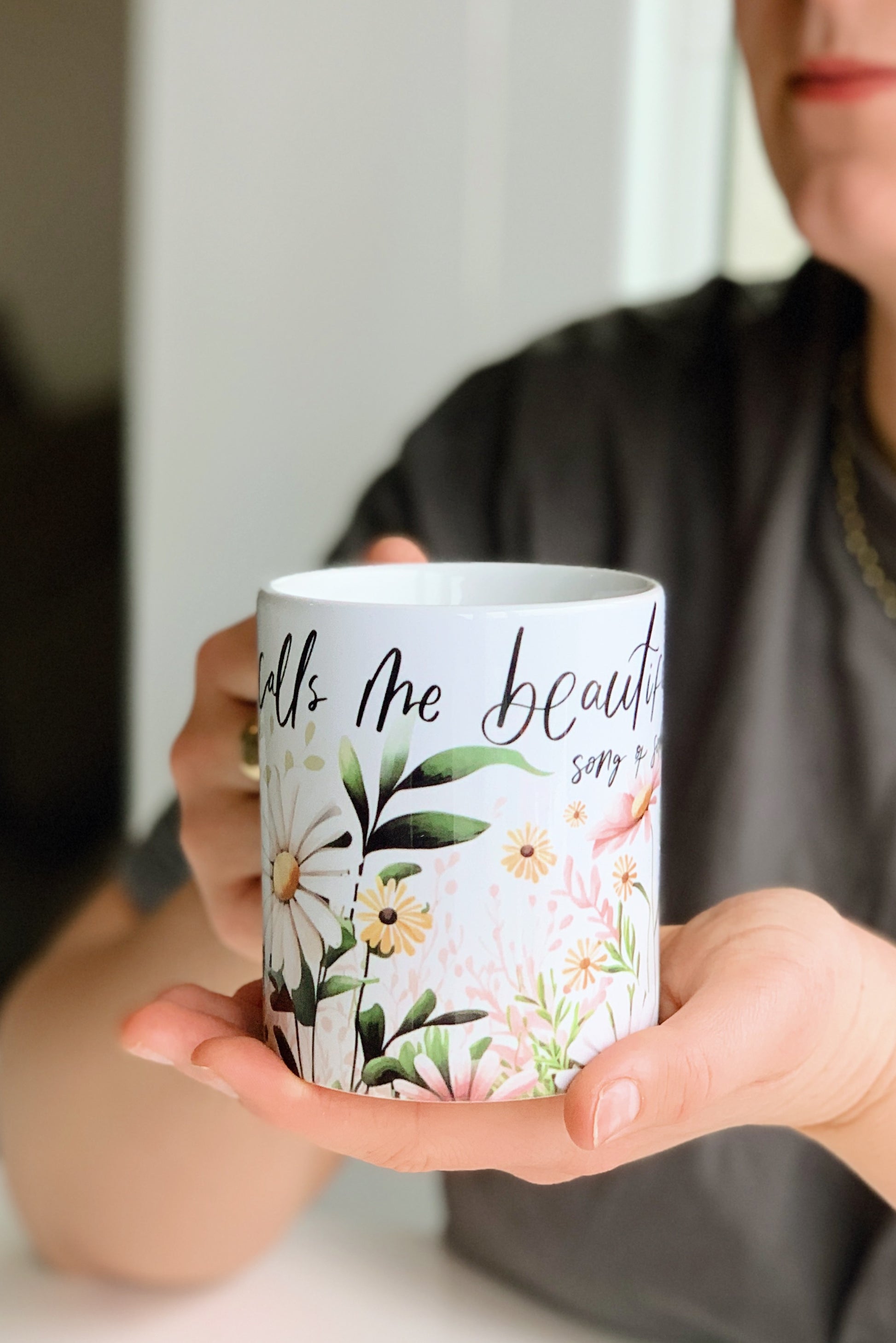 A beautiful floral mug with the verse 'He calls me beautiful one Song of Solomon 2:10' hand lettered and designed by Sharmila Joy.