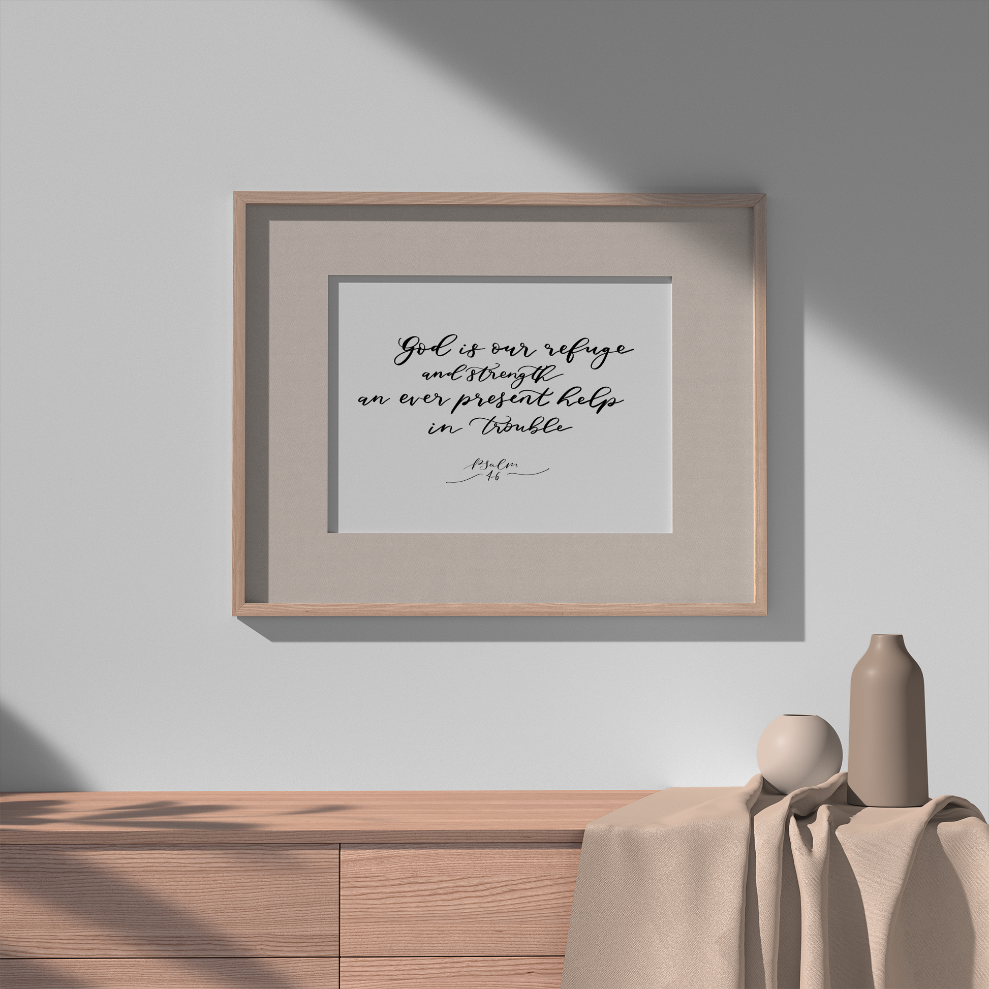 A powerful reminder that God is our refuge and strength. This modern hand-lettered theme theme lends itself beautifully to any area in a home, church or office.