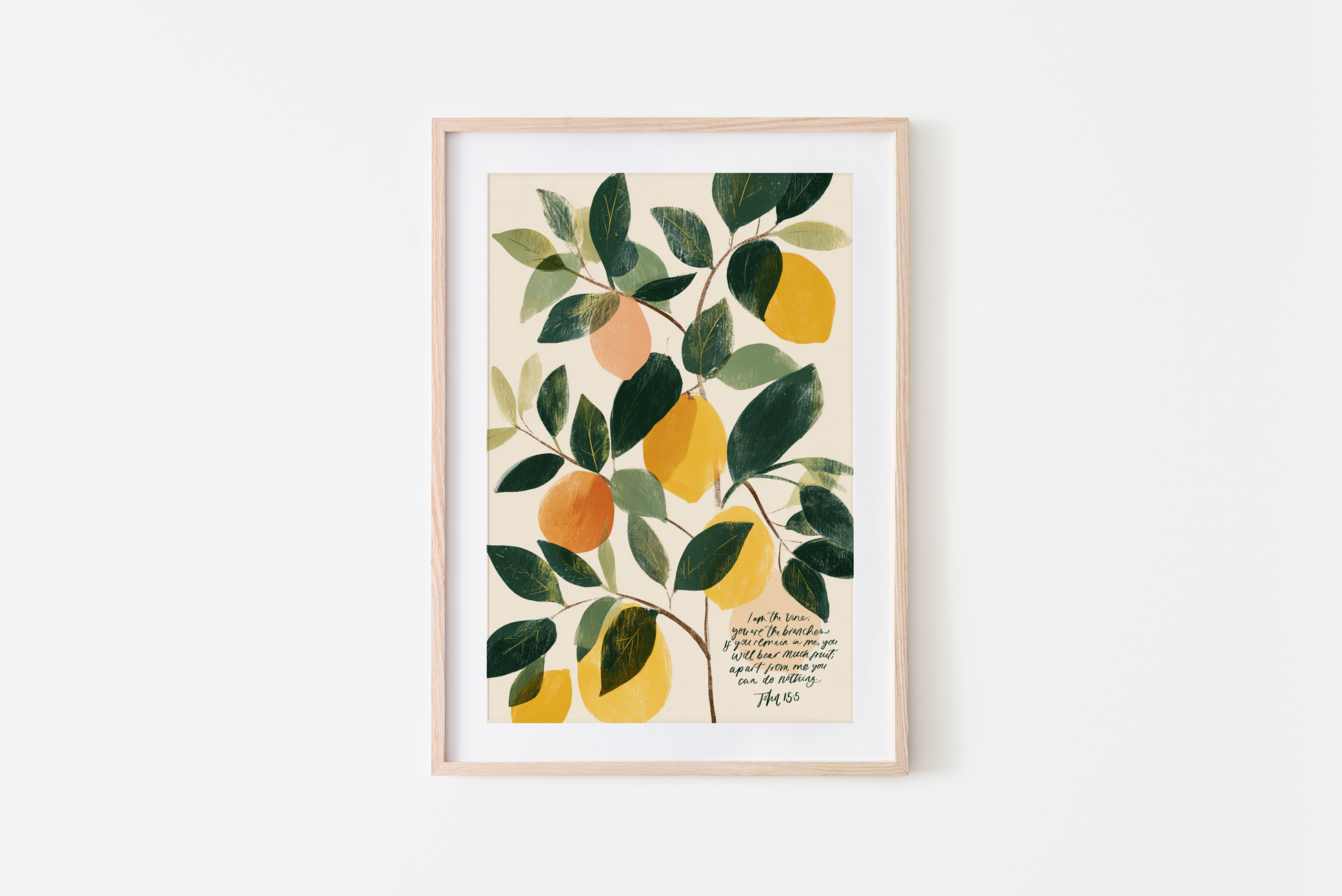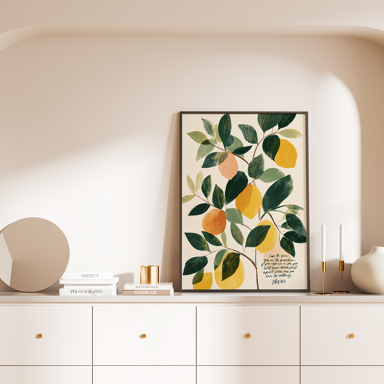 Bring fresh faith and inspiration into your home with this vibrant lemon tree art print featuring John 15:5 — "I am the vine; you are the branches." A perfect blend of nature and scripture, this print adds joy, encouragement, and a pop of colour to any space. Ideal for gifts, gallery walls, or quiet corners of reflection.