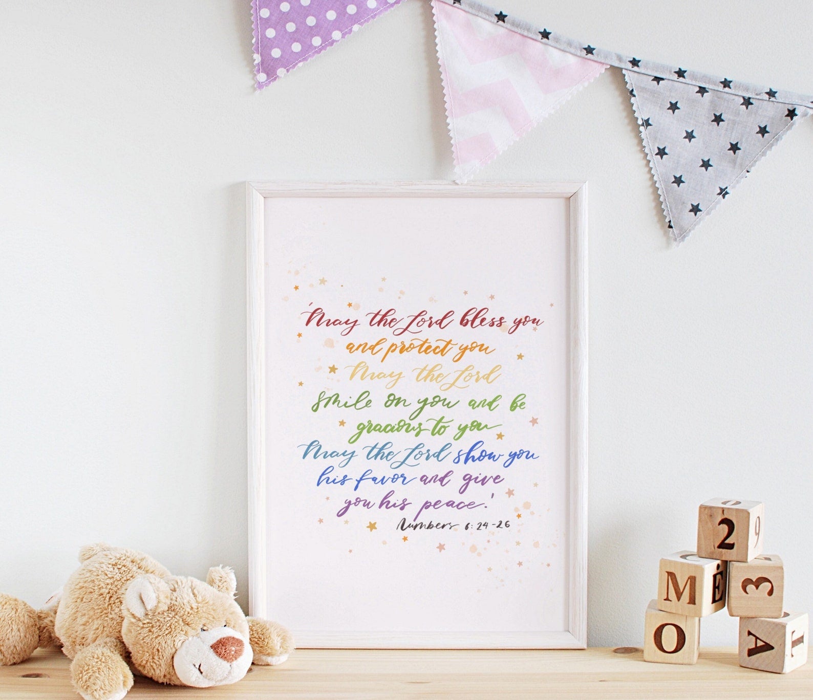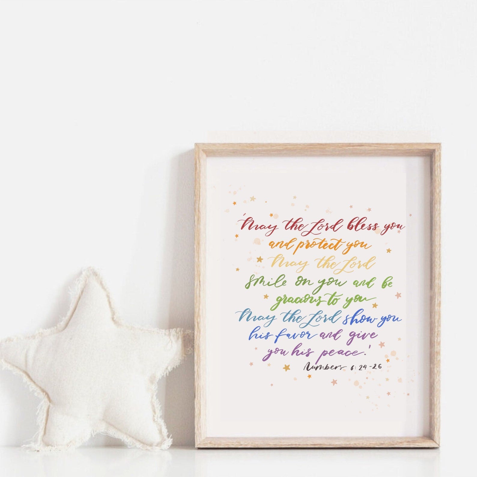 A lovely print suited perfectly for nurseries and children's rooms! But this modern hand-lettered theme really lends itself beautifully to any area in a home, church or office.