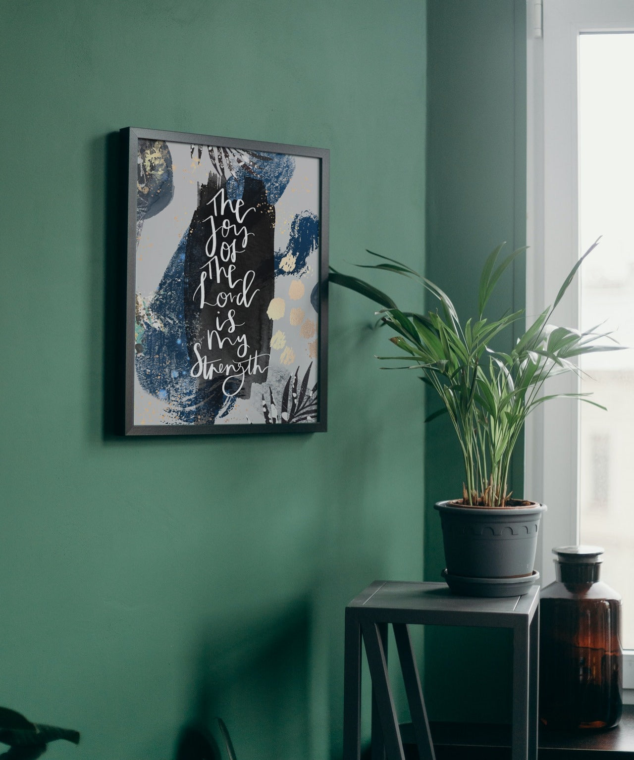 A wonderfully unique mixed media piece of art, with The Joy of The Lord clearly hand lettered. This print is a powerful reminder to display in any home, church or office.