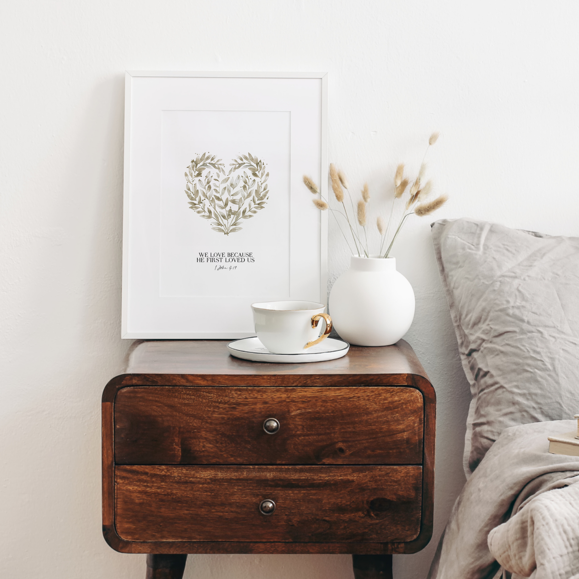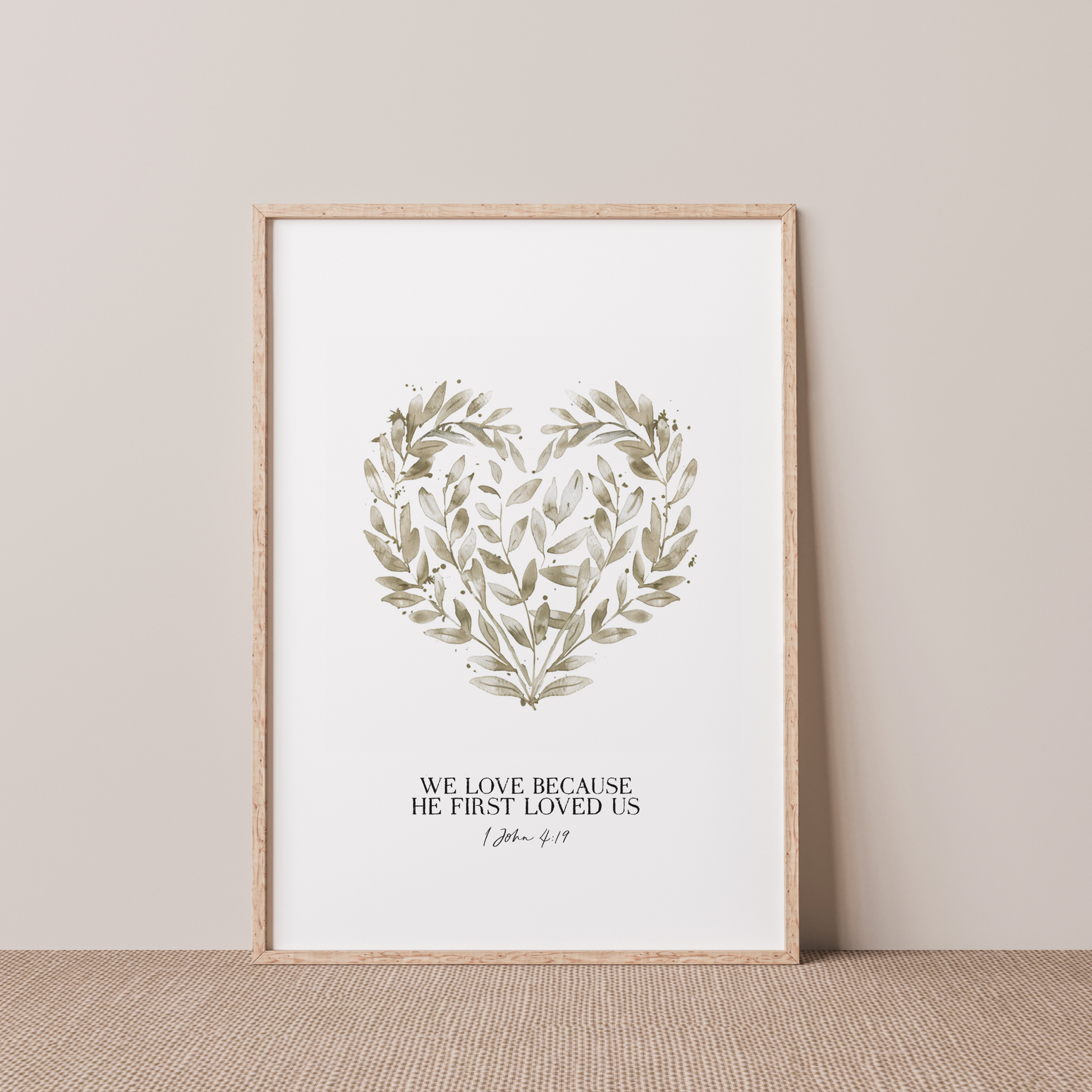 A beautiful and simple art print reminder of 1 John 4:19, We love because He first loved us.